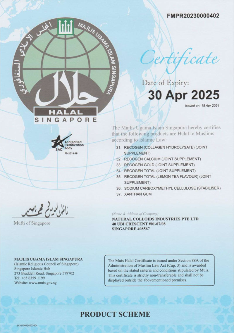 All our Recogen products are certified Halal by Majlis Ugama Islam Singapore (MUIS). You may find our MUIS Halal Certification here.