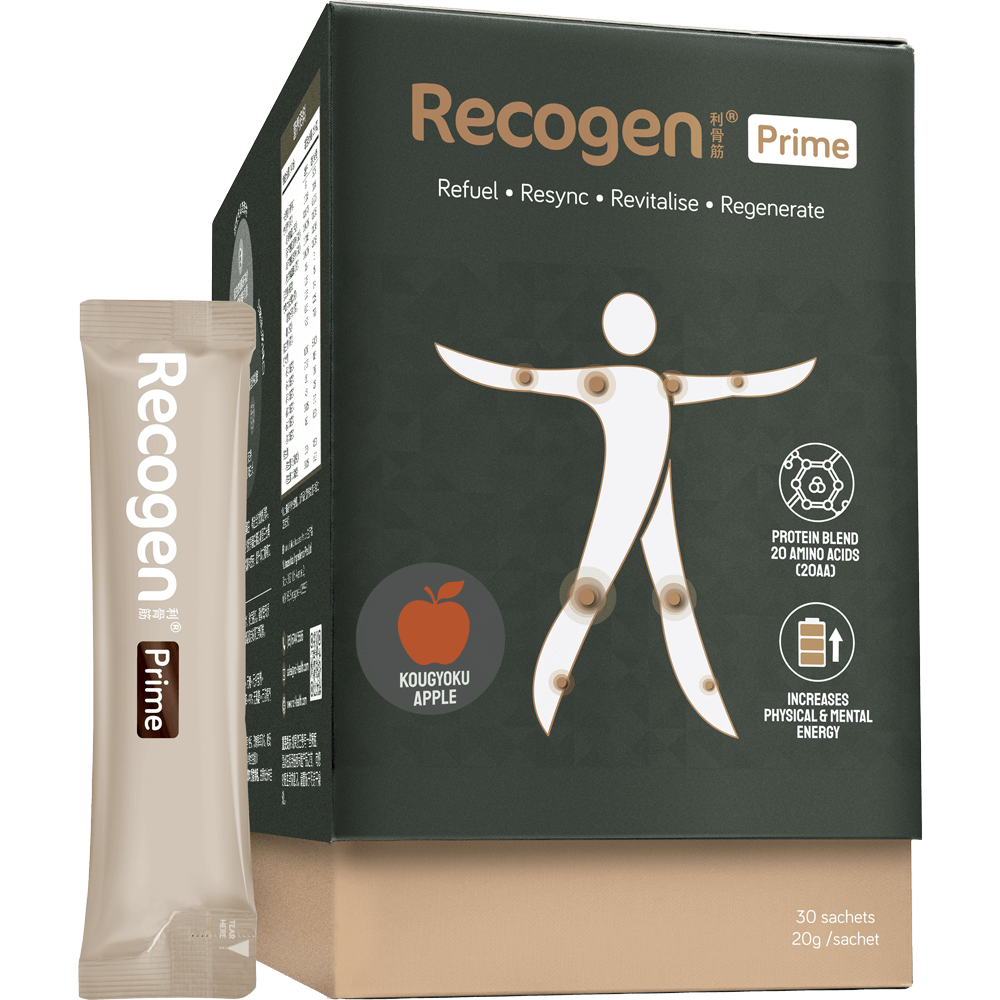 Power your day with Recogen® Prime Kougyoku Apple! Each sachet combines Bioactive Collagen Peptides, Whey Protein Isolate and a superfruit complex in a light, crisp apple flavour to support energy, focus and recovery — helping keep your body and mind in sync with your active lifestyle.