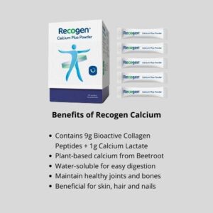 Recogen Calcium Plus Powder是采用干净且安全的纯生物活性胶原蛋白肽和来自甜菜根的植物性乳酸钙组成。非常适合那些希望服用胶原蛋白以维护关节和钙质以保持骨骼健康的人。每袋Recogen含有有1克来自甜菜根的水溶性乳酸钙 。